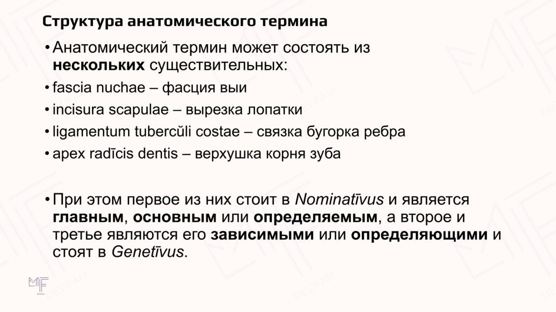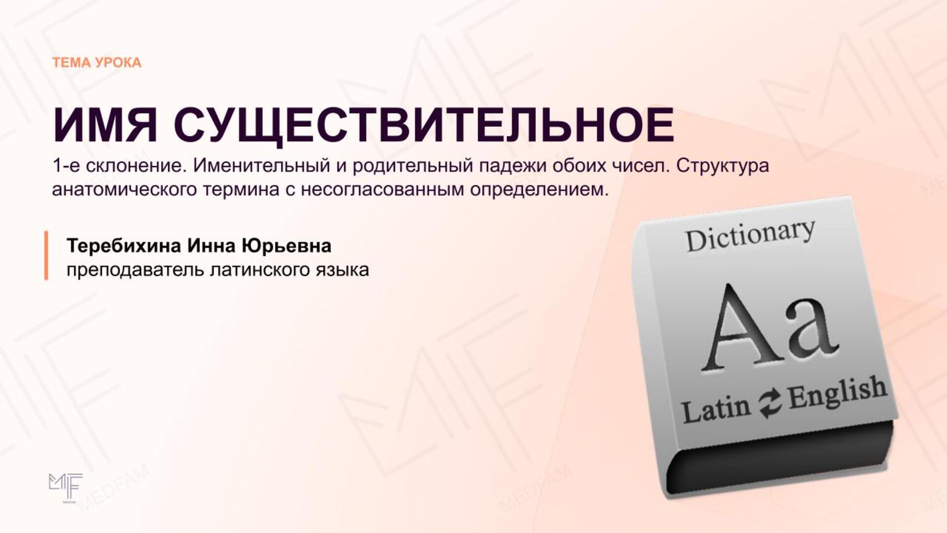 Имя существительное. 1-е склонение. Именительный и родительный падежи единственного и множественного числа. Структура анатомического термина c несогласованным определением.
