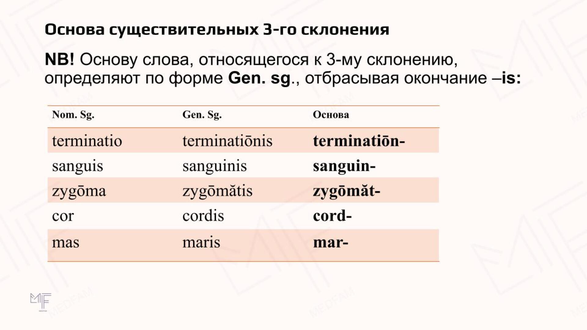 - образцы согласования латинских прилагательных с существительными 3-го склонения.